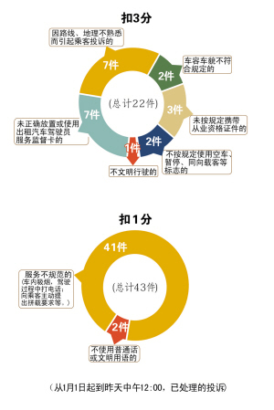 市运管局介绍,从元旦起到昨天,共收到出租车各类投诉367件,其中一次性扣掉10分(相当于总分的一半)的,共36件,多为拒载、议价;一次性扣掉5分的,多达145件,很多出租车被认为不按规定秩序停车、营运。(详见上图)