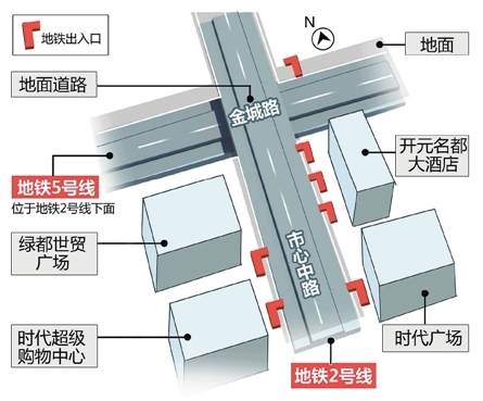 人民广场站的位置很好找,就在市心中路和金城路的十字交叉口位置,沿市心中路(南北向)布置于道路下方。