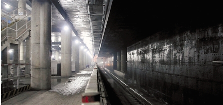 刚刚看到的那个水泥台阶,是将来此站的1号出入口。戴着安全帽,记者猫着身子穿过密布的钢架结构。下到了站厅(地下一层),立即豁然开朗:眼前就像是地铁站厅的毛坯房,虽然内部还有很多机电设备、施工材料,但是整个主体结构完全就是现在1号线站点的熟悉的样子了。