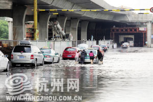 杭州路桥有限公司介绍,造成此处积水的具体原因是附近的雨水管道发生了坍塌。该公司一名姓胡的工作人员说:“雨水管在下大雨之前就坍塌了,结果又遇上了暴雨,水都出不去。”
