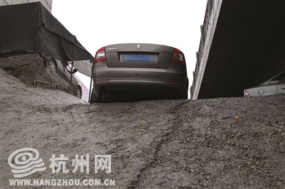 那辆斯柯达明锐车头朝上,也就是说,该车是倒着下坡开到斜坡上的!好在斜坡上有一条10厘米高的水泥坎,抵住车辆后轮。