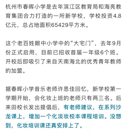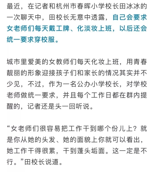 男老师也乐了 作为学校“唯四”的男老师,齐老师倒是对学校这一提倡表示相当支持:“虽然我们的女老师本身就已经很美了,当然化浓妆肯定是不符合教师的职业形象,不过化淡妆之后,可能偶尔有些痘痘之类的小问题,都被修饰了,非常赏心悦目,而且淡妆对皮肤的伤害也比较小,我们还是很支持的。 当然,虽然我们男老师和化妆不搭嘎,至少自己也会注意下仪表,不能太邋遢。” 不少女老师也表示,借机又get了一门新技能。“形象也是生活工作中的一部分,除了内在的功底,同时也要注意外在的形象。我一直记得上大学时,我们课堂礼仪课老师说的一句话,出门前画一个简单的淡妆,是对别人的尊重。”春晖小学的施老师说。 “工作生活中不仅要慧中,还要秀外啊!”语文老师沈老师表示。 不过,特殊的工作性质,让小学老师们本来就需要每天比别人早起很多,再加上化妆,会不会增加负担? “刚开始有些老师可能没有化妆的习惯,后来一经提醒,也都习惯了。淡妆也不需要太多时间,20分钟就搞定了。”春晖小学的张永爱老师说道。 教师仪表有无统一政策规定? 杭州其他学校这样做 提倡老师化妆上班有没有相关政策依据?记者咨询了几位不同学校老师及教育局工作人员,均未得到肯定的答复,而大部分学校对于教师仪表或是没有具体成文的准则,或是有类似规定,但不会做严格要求,只有少部分学校会做严格规定。 “我们学校对老师的仪表是有相关要求的,比如要求老师们穿正式的衣服,化淡妆等等,但没很具体,一般有大型活动时会统一穿校服、围巾等。另外由于公办小学校服经费问题、师资变动(新教师、调动)等问题,所以很难有一套人人都有的校服,只能大多数统一,新入校的则相对颜色.款式相同(近),平时则不太要求了。”上城区一所公办小学的老师告诉记者。 “我们有要求穿校服,学校的教师78条细节里,有对教师穿着打扮的具体要求。”一位老师说道。记者查看了该细节具体内容,发现其中包括女教师不化浓妆,不涂颜色艳丽的指甲油,不长发披肩;男教师发不过耳,勤刮胡子等。 【记者手记】 在生活中,是否化妆属于个人自由,每个人对于美的理解和追求也不应该只有唯一标准。但在部分职业和工作场合中,在仪表仪态方面有自我要求会更有利于工作的开展。 学校管理者通过语言提醒、物质激励、制度制定等措施,对教师仪表做要求,以期树立良好的教师个人形象和学校,间接对学生及家长产生正能量的影响,值得肯定。 鼓励教师化淡妆,肯定年轻女教师对于美的个人追求,甚至在学校开展教师化妆培训,也是时代进步的体现。不过,学校管理者在规则制定时也要倾听老师们的建议,充分考虑个性化、人性化的需求。