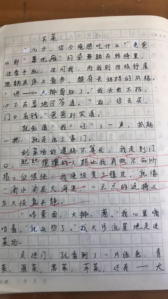 来看全文。 《买菜》 “儿子,你今晚想吃什么?”老爸以那“葛优瘫”的姿势躺在转椅里,边看手机,边问我,而我则四肢舒展地躺在床上看书,颇有长妈妈的风格。“嗯——大排面好了。”我头也不抬,心不在焉地回答道。“好,你去买,门口有钱。”老八奸笑道。 就知道!我“呸”了一声,抓起一把,就走出了家门。 到菜场的道路不算长,我走到门口,熙熙攘攘的人群让我有些不知所措,但很快,我便恢复了镇定,就像一滴水滴在大海里,一点点的涟漪之后有恢复平静。 “鸡蛋面,大排,葱。”我心里嘀咕着,“就这些了。”我大步流星地走进菜场。 走进门,就看到了一片绿色,青菜,菠菜,蒿菜,荠菜,还有——大葱!别藏了,我看到你了!“老板!三根大葱!”我向老板吆喝道,“好嘞!”老板挑出三根大葱,称好后交给我。我凑上鼻子一闻——嗯!一股浓郁的葱香,葱绿得像要滴水呢! 接下来是大排,走到店口,我突然犯难了——有好多店,哪一家好啊?看他们摆出来的肉,都是挺好的呀!怎么办呢?选择恐惧症这个东西真的好可怕!怎么办……有了!吃是我的任务;花的是老爸的钱!嘿嘿,老爸,对不住了!我心里偷笑着。不用问价格,我早就知道它们的价格了,最贵的店的老板见是本“菜场游侠”,也不敢马虎,挑了五块上好的大排,交给了我。我一捏,软软的,好肉! 买完鸡蛋面,我回到家,外婆还在做糕点,老妈还在学,老爸还在写诗,妹妹还在睡大觉。看这个家,我心中感慨万千,总有一天,我也要和一个姑娘一起撑起一个家。 |