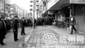 昨日8:31,严先生来电:三墩路这边有一个男子,正拿着一把刀跟警察对峙。他靠在一家药店的门口,情绪比较激动。不知道他为什么跟警察发生冲突,警察已经朝天鸣了一枪。围观的群众比较多。我现在要赶着去上班了……