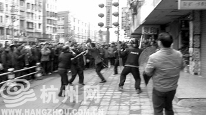 持刀男对持枪民警说,你开枪打这里。本版照片据读者胡松春DV截屏