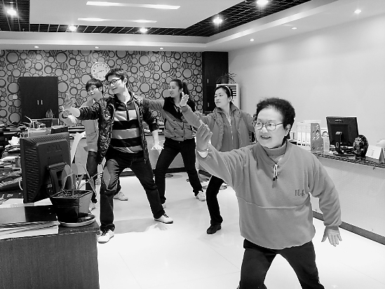 高阿姨在办公室里教白领打太极。