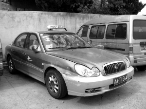 这辆套牌出租车是一辆现代索纳塔,车窗上贴的机动车检验标志(估计也是假的)显示,这辆车至少用过三个车牌号:浙AT39□□、浙AEX1□□和浙AT1564。