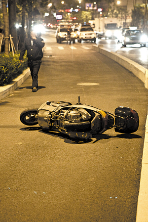 在事发地,道路隔离墩旁,一大摊殷红的鲜血触目惊心。一个小伙子凑上前看了看,转身吐了。前方大约三四十米处,一辆黑色的摩托车横倒在地,车很完整,看不出有明显损坏。