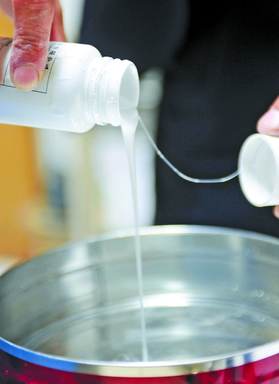 两个容器分别盛入约2公斤水,各添加了约10克的液态、粉状增白剂。粉状增白剂立即使水变成了白浆;而液态增白剂则需要搅拌。