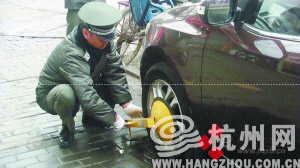 执法队员刚输入车牌,手里的“城管通”就滴滴滴地叫个不停,红色字幕显示,这辆车已经有5次违停记录,而且都在大关一带。按照相关规定,执法队员给车子上了锁。