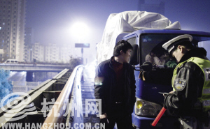 10日晚8点30分,我跟随机动大队交警在高架南向北环城北路下口处设点检查。晚9点左右,值勤交警的对讲机传来指令,有一辆货车上了中河高架,请沿线交警注意拦截……