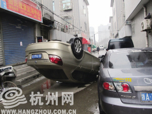 农都市场南门外约300米处,白田畈的巷子里,一辆香槟金色的大众朗逸撞上路边店铺的台阶后翻车,还一路撞坏了一辆自行车,一台空调外机和两辆停在路边的私家车。