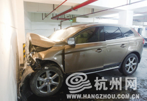 昨天下午5点多,两三个保安守在地下车库,一辆沃尔沃越野车停在车库尽头,车头死死顶在墙上。