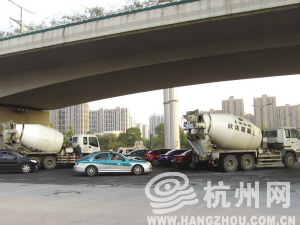 记者核实报道:昨天下午2点,在瓜山立交桥附近见到了许师傅。他三十出头,在杭州开混凝土搅拌车已有3年多。