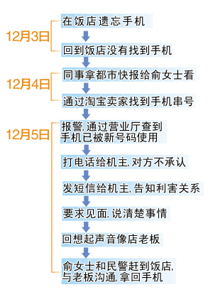 后来我发现这个人的说话声音有点熟悉,仔细一想,好像就是那家饭店的老板。我和警察去店里找了那个老板,刚开始他百般抵赖,后来还是把我的iPhone4S还给了我。真要谢谢快报和派出所的民警,没有你们,我的手机是拿不回来的!