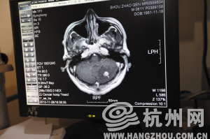 寿师傅肺部的恶性肿瘤已转移到脑(光标箭头所指)