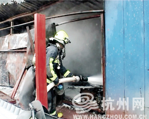 昨天下午1点16分,朝晖消防中队接到杭州市119指挥中心转来的报警:东新路附近的王马里37号杭锅集团内,一简易油漆工棚发生火灾,情况紧急。