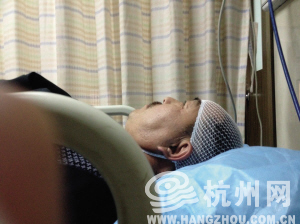76路公交车司机赵师傅被撞了,头裹纱布,想起床,但还觉得晕乎。
