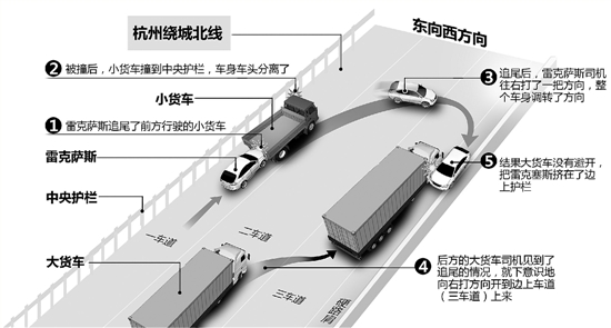 后方的大货车司机见到了事发时的情况。他说,当时自己开在中间车道(二车道)上。眼睁睁地看到雷克萨斯撞上了小货车,他就下意识地向右打方向开到边上车道(三车道)上来,想避远一点。可没想到,还是撞上了。“雷克萨斯车速挺快,追尾后虽然往右偏了,但速度还是很快。”