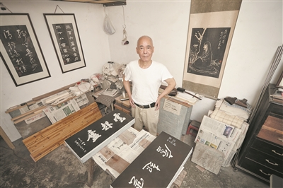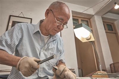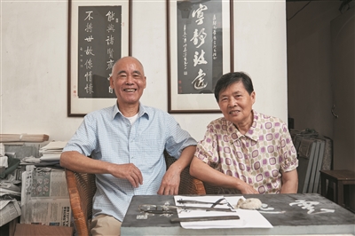除了刻石,黄良起(左)与夫人邹菊英(右)很少关心外面的事,就这样简简单单地过生活。 黄良起从不关心别人的工作室是什么样的装修,他只觉得这间老房子冬暖夏凉挺好,刻刀一握一坐就是一天,年年如此。 黄良起的父亲也是这样,虽然很有名,但始终抱着一颗平常心。他经常与黄良起说,“名气再大也不是永远,心里平平淡淡的最好。” 几十年过去了,这句话也成了黄良起的处世标准。在黄良起看来,平常心,是眼前之境就是真心的显现,也诠释了他世俗生活和艺术生活浑然和谐的人生体味。保持平常心,踏踏实实认认真真地过好当下;保持真心,探求艺术世界和人生的根本。 黄良起不仅是这样身体力行的,也这样影响着身边的人。黄良起的夫人和两个儿子都会碑刻。遇上刻不过来,时间紧迫的“大任务”时,也会全家齐上阵。 黄良起的夫人邹菊英说,平时两人会讨论怎么刻,刻不好的地方也会相互指出来。几十年来,石头都是两个人一起搬,一起抬。除了刻石,他们很少关心外面的事,就这样简简单单地过生活。 就在说话之间,黄良起的儿子黄臻伟已经完成了两张乌黑油亮的乌金拓。这是他从小耳濡目染,帮着父母做的最平常的活儿。尽管现在他和弟弟两人都有自己的工作,但一周总会抽出时间来帮着父亲做点事,他和弟弟的两个孩子也最喜欢到爷爷的工作室来,看着书听着叮叮当当的刻碑凿石声,在孩子们眼中,这是爷爷最快乐的事,也是他们共同的最美好的时光。