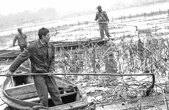 工人们把船摇到秋水山庄前,开始收割残荷:“再不干这活儿,烂根就要污染西湖水了。不能等啦。”