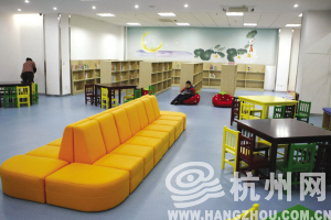 一楼是办证大厅、少儿活动区。少儿活动区里有彩色小桌椅、小沙发,低矮的小书柜里陈列适合各年龄段小朋友阅读的书;还有一块铺着彩色垫子的亲子活动区,适合0到3岁的小宝宝游戏、玩耍。