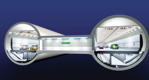 答:隧道管径有近11米左右高,上面2/3行车,下面预留着1/3的空间作为逃生通道。在江中圆形盾构隧道段中采取的是纵向逃生法。