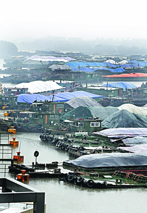 运河杭州段封航后,在杭州义桥锚泊区停泊的船舶最多,站在岸边三层楼上放眼望去,望不到船的边际。中午时分,河面上炊烟缭绕。