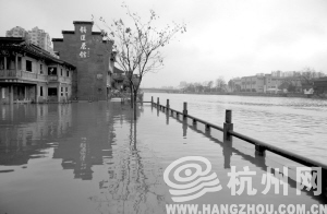京杭运河拱宸桥东侧,钱运茶楼与酒楼一层被水淹没。