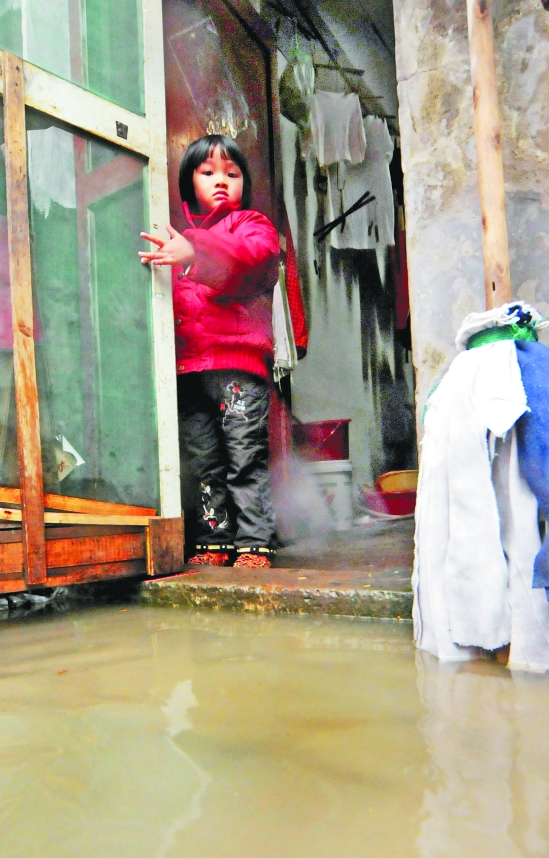 瓶窑镇上,小女孩看着大水漫到家门口。 尹炳炎 董旭明 摄