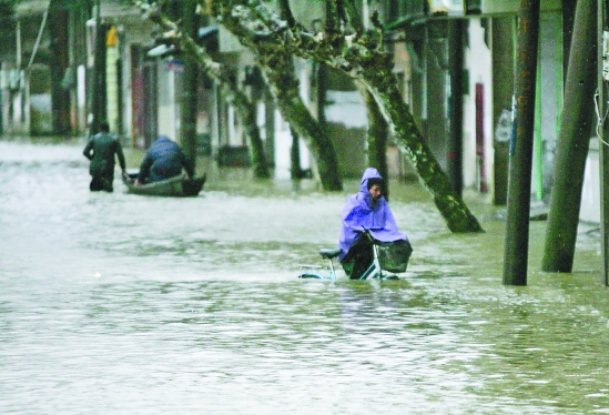 瓶窑镇西溪街上,一位居民推着自行车,在水中艰难向前。 尹炳炎 董旭明 摄