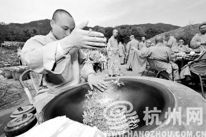 3月25日,雨过天晴,中天竺法净寺的僧人们在举行了庄重的开茶仪式后,开始在归属寺院的50余亩龙井茶地里采摘“法净禅茶”。法净寺的茶园位于灵隐景区稽留峰下,属西湖龙井茶原产地一级保护区,栽种的全都是西湖龙井的群体种,是僧人们自种、自采、自炒和自用的有机绿茶。由于茶园远离公路,山中雾气氤氲,且从不对茶树施加农药化肥,因此所产茶叶绿色纯净,品质上佳。据介绍,茶与禅在中国文化中一直有不解之缘,通过品茶参禅,体悟人生、净化心灵、启迪智慧,而禅茶是佛家“以茶悟道”的一种特有茶文化,源自“茶禅一味、茶僧一缘、茶寺一体”之说。
