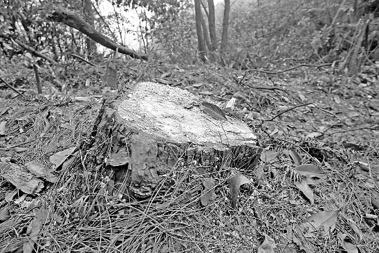 北起古荡老和山脚的“十里龙脊”群山,是杭州人游山的热门线路。清明假期,马先生从上天竺上山,一路游览“十里龙脊”。可当他走至大清谷附近山脉时,发现不少树木被砍掉了,留下了一个个树桩。被砍的大多都是松树,树桩大的直径有30多厘米,小的也有10厘米左右。
