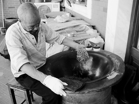 炒了30多年茶的老朱是戴大姐的亲戚,这两天向单位请了假,来帮忙炒茶叶。