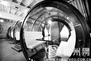 李虹所说的“酷电”,就在5号楼,原浙江新华印刷集团的胶印车间。1000多平方米的场地犹如一个奇妙的未来空间:铁艺圆筒一般的卡座,架空玻璃覆盖的主通道,以及正播放着欧洲模特走秀的硕大投影屏,甚至连男厕所里面的小便器都是雄壮的弯曲铁管。而这些现代艺术与厂房梁柱上“文革”时期留下的红色标语形成反差,又给人穿梭时空的享受。企业负责人樊向亮解释说,这里白天是产品设计的发布、展示平台和会务场所,到了晚间则变身为各种原创、潮流音乐的文化交流地。今年3月1日试运行以来,最大的一次展示、交流活动,规模突破了400人。