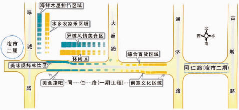 整个夜市分两期建设,现在启动的是一期项目。一期规划范围为三墩镇同仁路(厚诚路至通济路路段),全长约300米,宽28米。