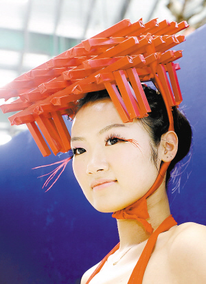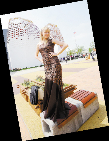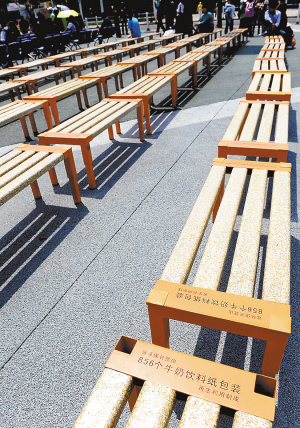 5月1日,游客在新式环保长凳上休息。这些摆放在世博园区内的长凳,每条是由856个牛奶饮料纸包装回收制作而成的。 |
