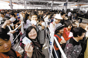 早上7点刚过,尽管距开园仪式开始还有一个多小时,但世博园的各个入口前都早已排起了长长的队伍,来自世界各地的游客,都期待着第一时间进入世博园区,一睹世博盛会的风采。“我们已经等了快一小时了,为了能够早点入园,全家人凌晨5点就起床了,没想到还是有那么多人比我们来得要早。”早上7点25分,在世博园浦西园区5号入口前,来自陕西的王同一家手拿门票,不时地随着入园的队伍有序地向前缓缓移动。一想到即将展现在自己面前的众多场馆,40岁的王同抑制不住内心的兴奋:“我们很早就订好5月1日的门票,全家人一起来上海看世博,能够在开园当天就参观世博园,就算排队也十分值得。”