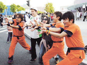 三名工作人员身着日本动漫《龙珠》里的龟仙流练功服在日本馆外与观众合影。