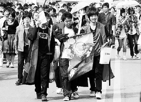 趁着中午休息时间,记者和其中一位中南民族大学的大二女生聊了起来。从高中起就爱上COSPLAY秀的她喜欢大家喊她“梦见”。“梦见”告诉记者,自己是“恋姬野餐会”社团的骨干。“我们社团团员主要来自武汉的高校,平时很难聚齐,大家就在网络上碰头,讨论剧本。这次动漫节正好又是‘五一节’,于是我们就想来看看人家高水平的表演是怎么样的。”为了赶上这场盛典,他们可是挤了一晚上的硬座,从武汉赶来的。