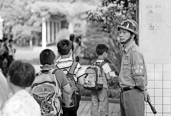 学校保安头戴钢盔,站在大门口,注视着孩子们平安进出。