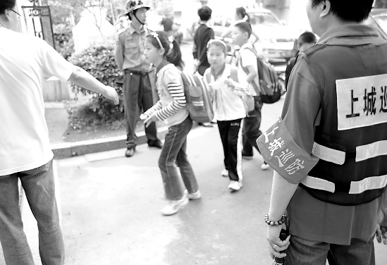 昨天上午7点30分,秋涛路小学门口,小学生们陆续走入校门。校门口,戴着头盔的保安注视着附近来往的人,手中握着一根橡胶棍。但引人注目的是,人群中还站着几个穿着橙色背心的保洁员,手臂上统一戴着“平安上城志愿者”红袖章。