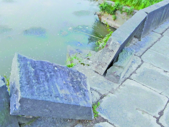 记者在现场看到,日新桥中间护栏的左右两侧各有一处被盗贼敲断的痕迹,望柱象、望柱狮、望柱猴就是从这里被敲下取走的。而在富阳市永昌镇青何村的那一侧,原本保存完好的一对抱鼓石也没有了踪影。