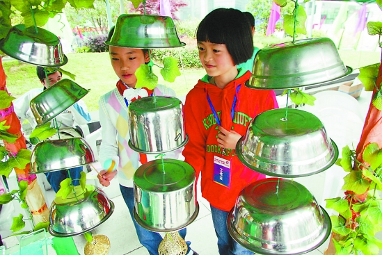 昨天,2010浙江省暨杭州市科技活动周开幕式在杭举行,学生们用锅碗瓢盆制作的乐器演奏出了美妙的乐曲。