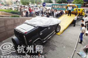 2007年10月10日下午,华浙广场地下车库拖出一辆辆被水浸泡过的轿车。围观者很多,有的还扛着摄像机。最后拖上来的,是这辆悍马,价值140多万元。记者 周涛 摄