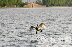 太阳出来了,西湖里的天鹅异常兴奋,在西湖上空飞来飞去。 记者 时鹏 摄