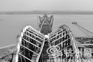 到昨天为止,大桥的第二个拱已经在岸上组装完成,六月中旬将往江中央推进210米。大桥的第三个拱将在11月份完成顶推。李泽友说,按照工程进度,到明年六、七月份桥身部分将基本完工,预计到2011年年底,九堡大桥可实现通车。