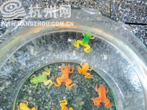 逛着逛着,在一家卖金鱼的店里,发现了一堆五颜六色的小青蛙。