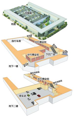 地下部分有两层。地下二层与未来地铁1号线龙翔桥站相连,还包括一个大型停车场,设计可停90多辆轿车。地下一层则为商业街。