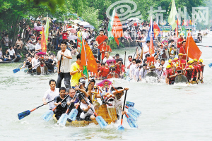 划手们挥动着划桨,在水面上溅起一阵阵跳动的水波,舟尾的艄公一起一蹲,让龙头吐出鲜亮的水花,岸上的人们或屏气凝望,或呐喊助威,为自己心仪的龙舟加油喝彩。昨天是传统佳节端午节,万众期盼的“我们的节日端午——2010杭州西溪龙舟文化节暨蒋村龙舟胜会”在西溪国家湿地公园正式上演,这场有着千年历史渊源的龙舟胜会共有200多艘龙舟参赛,吸引了6.5万名杭州市民前来观战。